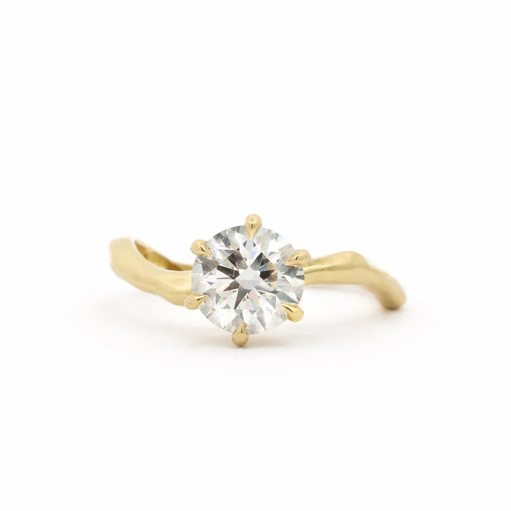 With a solid 18ct yellow gold organic band in a unique waved shape, this solitaire engagement ring is truly one-of-a-kind. Features a mesmerising 1.54ct lab-grown diamond.