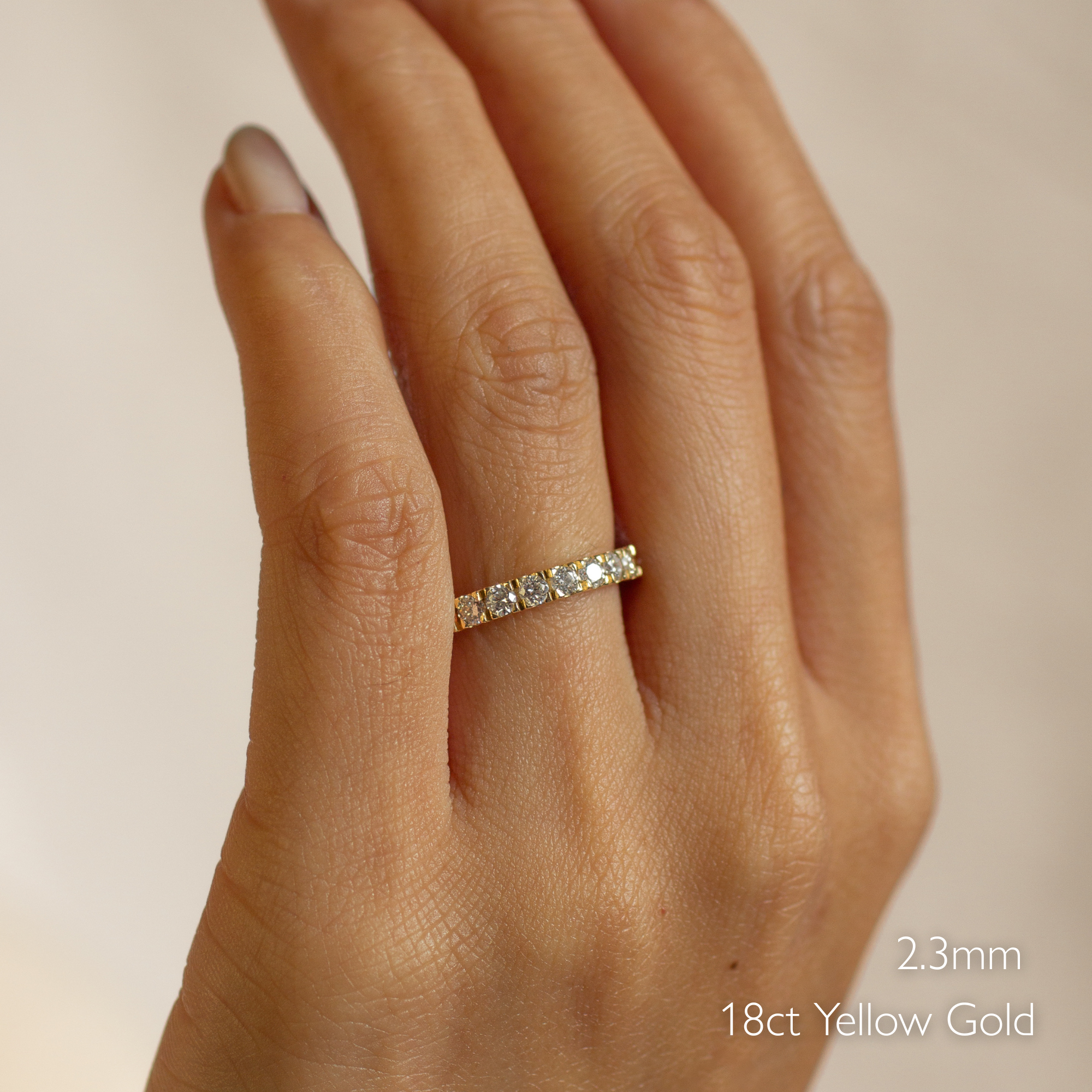 Our 3/4 Eternity Wedding Ring features an elegant row of lab-grown diamonds set in your choice of solid gold or platinum.