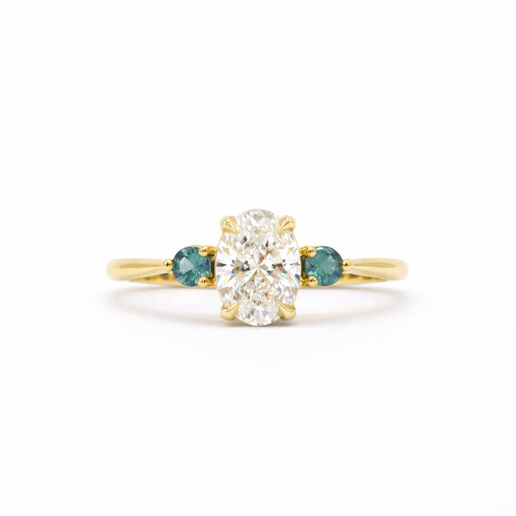 Oval Diamond and Green Sapphire Trilogy Engagement Ring