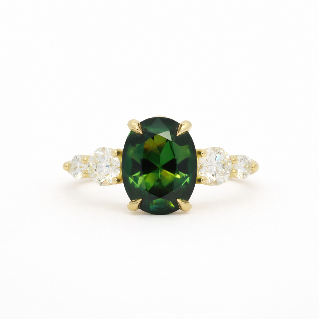 Large Bi-Colour Green Sapphire 5 Stone Engagement Ring with Tapered Diamonds