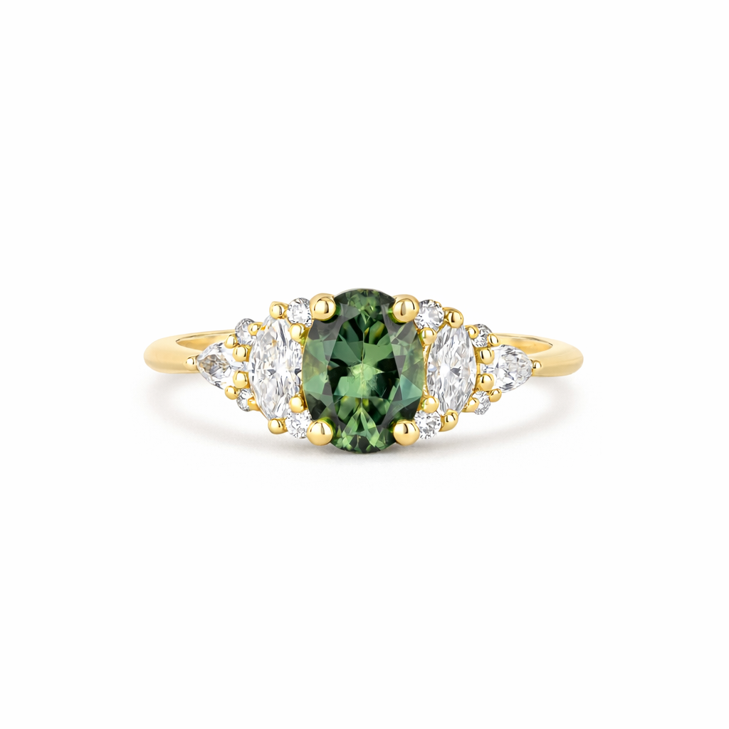 Discover our 13-stone green sapphire engagement ring, decorated with an intricate marquise and round diamond cluster. Low-set on a 9ct yellow gold band, this ring elegantly sparkles as it catches the light.