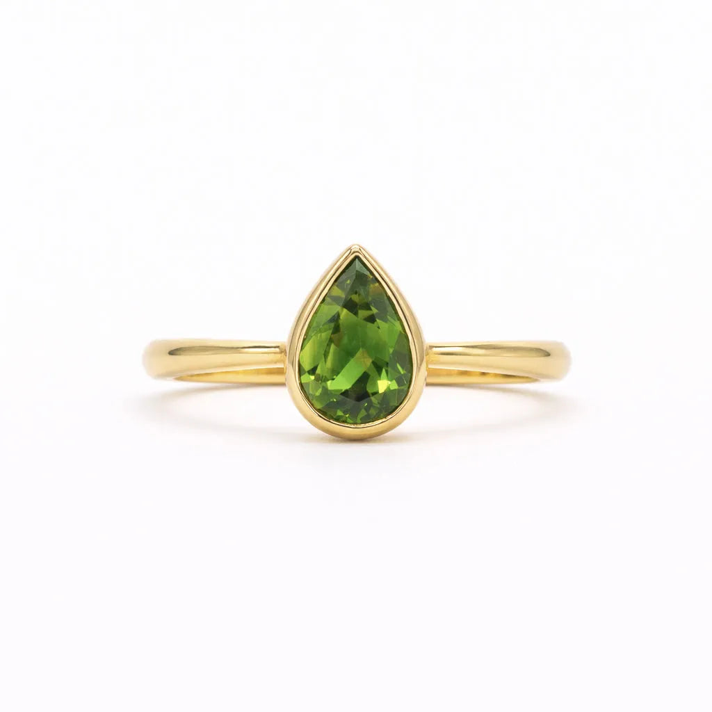 Bezel Green Pear Sapphire Solitaire Engagement Ring in gold on a white background