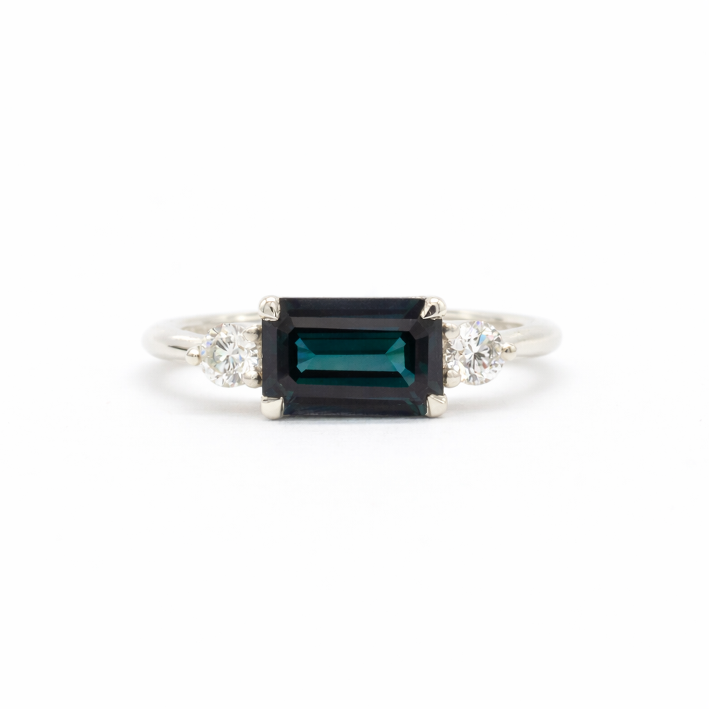 East-West Dark Blue Emerald Cut Trilogy Sapphire Engagement Ring-Engagement Rings-Wild Fawn Jewellery