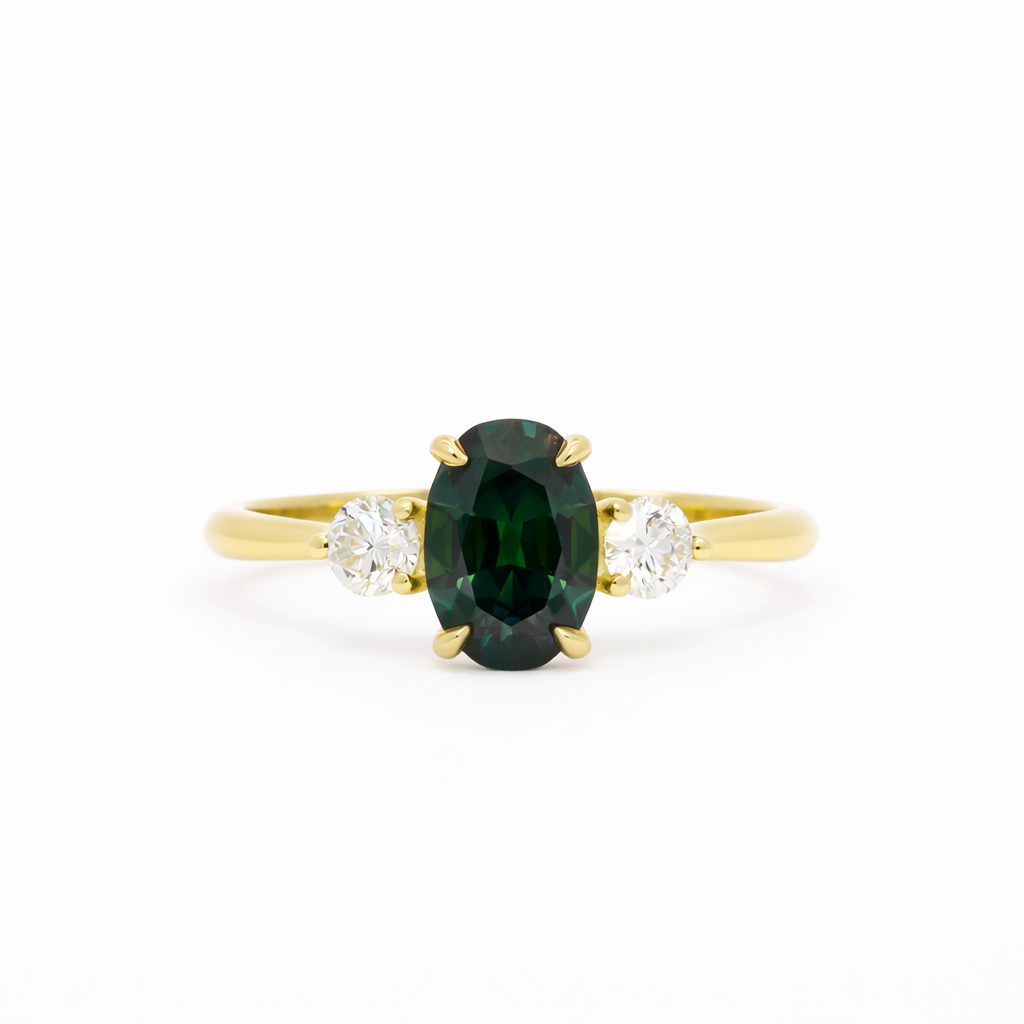 This 18ct yellow gold engagement ring has a vibrantly rich blue/green oval sapphire which radiates a remarkable vibrance. Accompanied by two 3mm round diamonds, this a is beautiful one-of-a-kind, high-set trilogy ring.