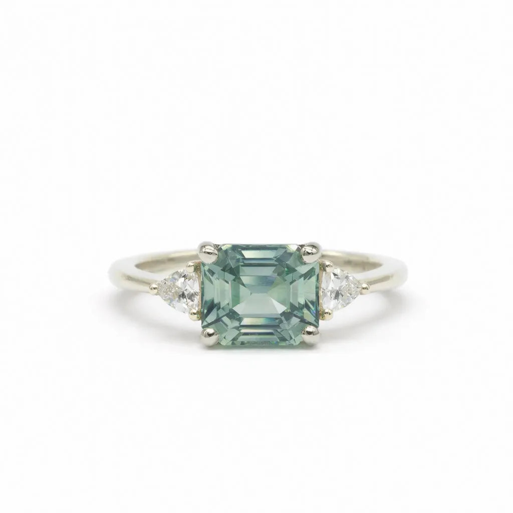This unique engagement ring spotlights a light blue emerald cut sapphire which sparkles beautifully as it catches the light. Accompanied by 2 trillion lab-grown diamonds for a one-of-a-kind shape. With a low east-west setting on a solid 9ct white gold band.