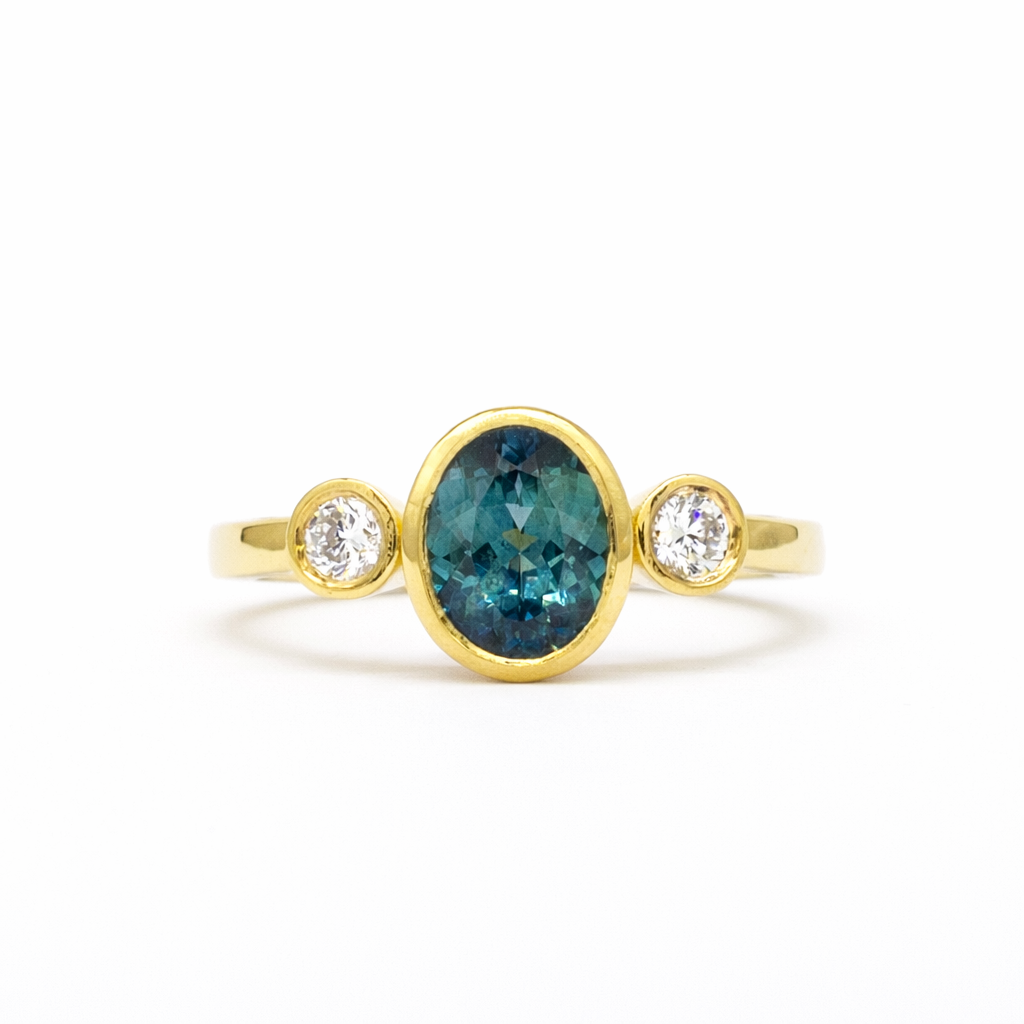 The centerpiece of this bezel-set engagement ring is the Malawi sapphire, which spotlights hues of teal and light blue as it glistens in the light. A trilogy, the design is completed with two 3mm round lab-grown diamonds.
