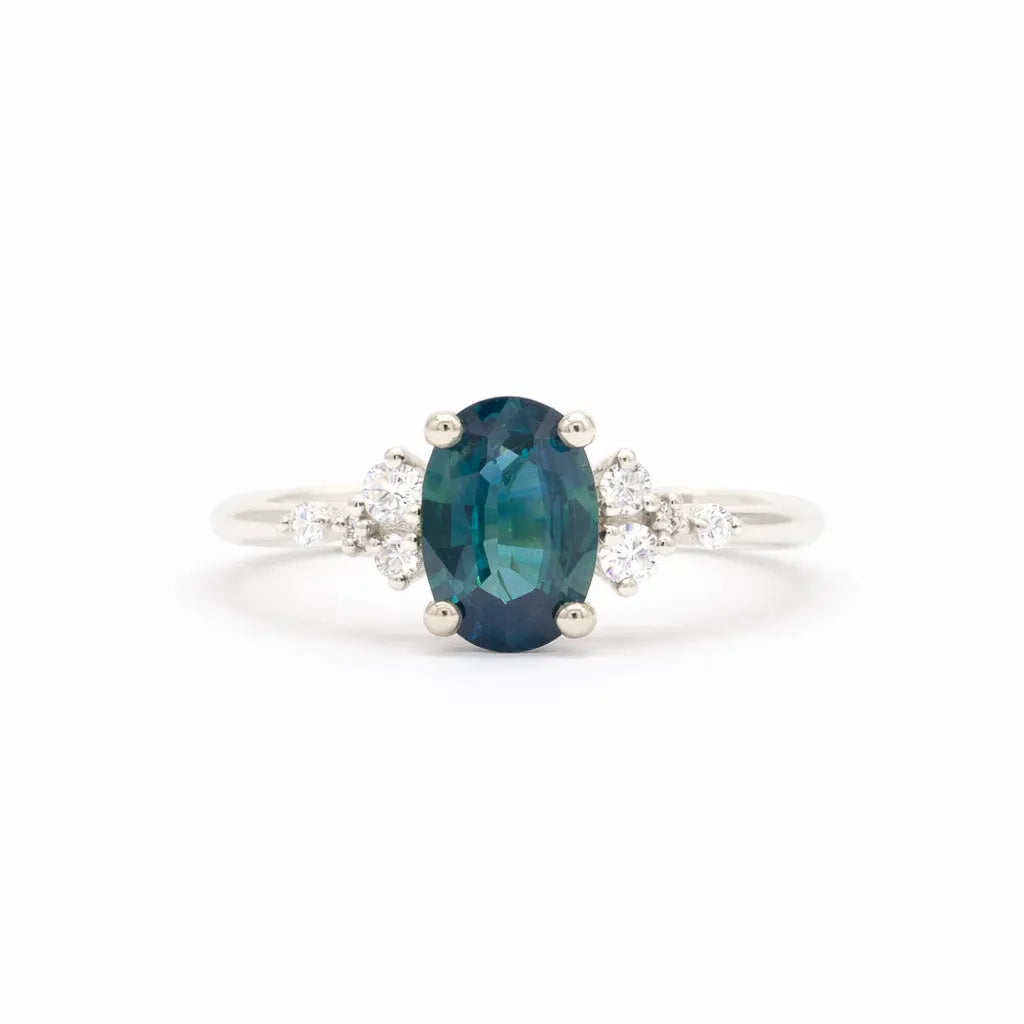 Oval Asymmetric Blue Sapphire Engagement Ring with Scattered Diamonds