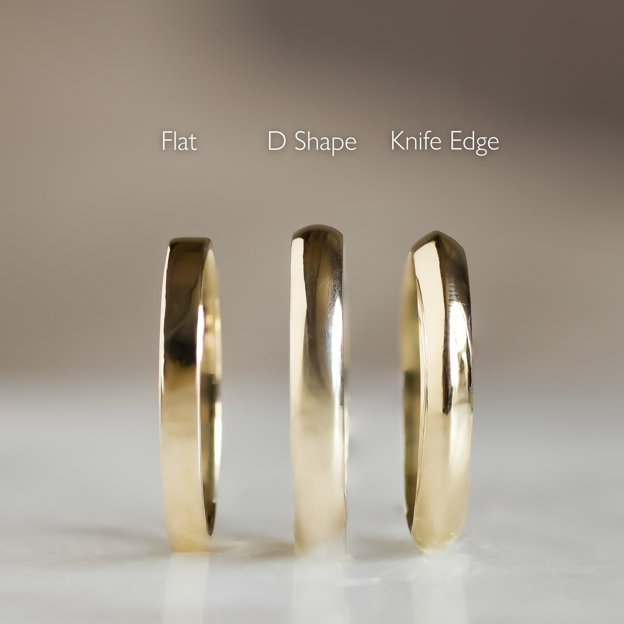 A D Shape wedding ring is one with rounded edges, while a Flat wedding ring has square edges.